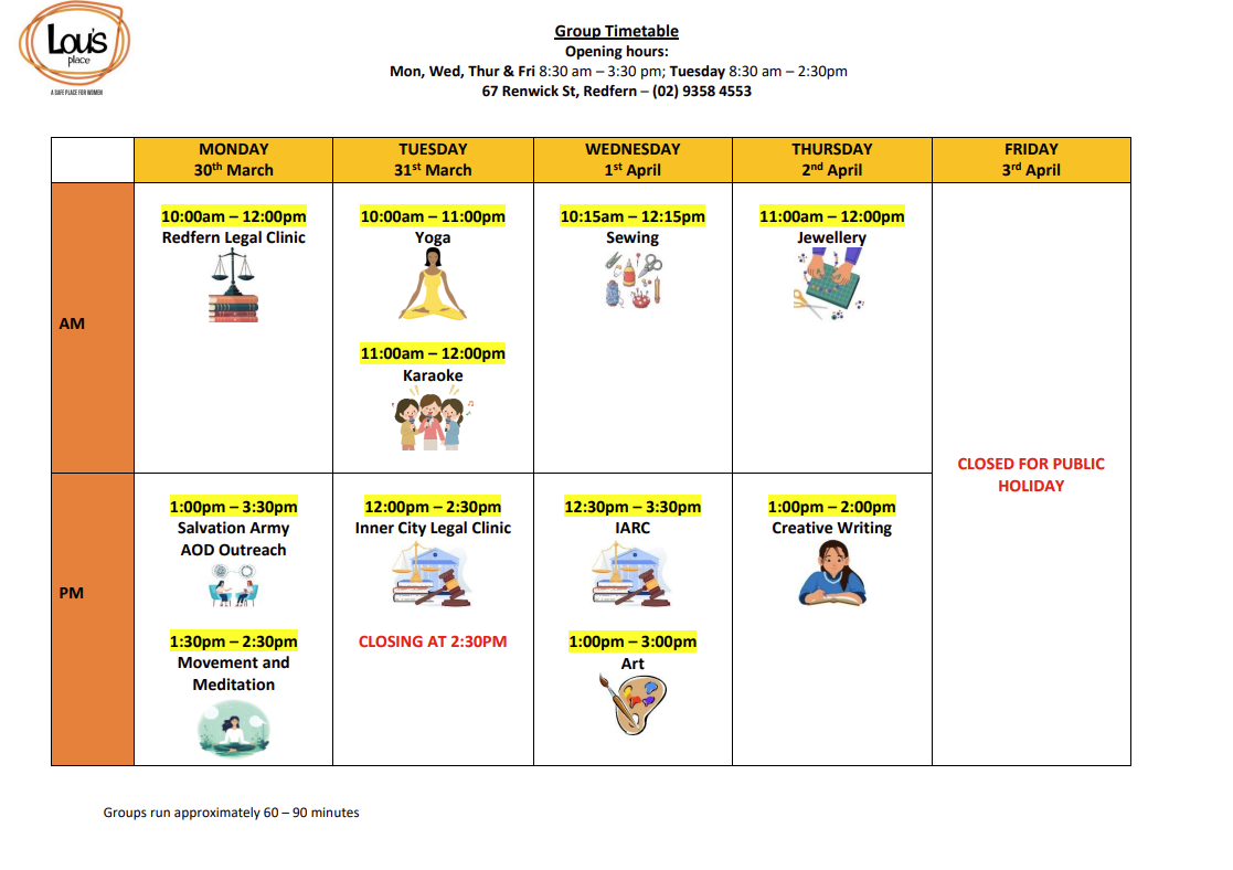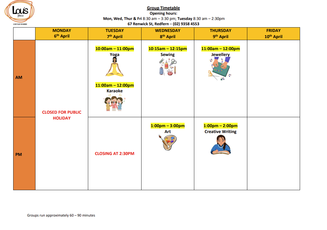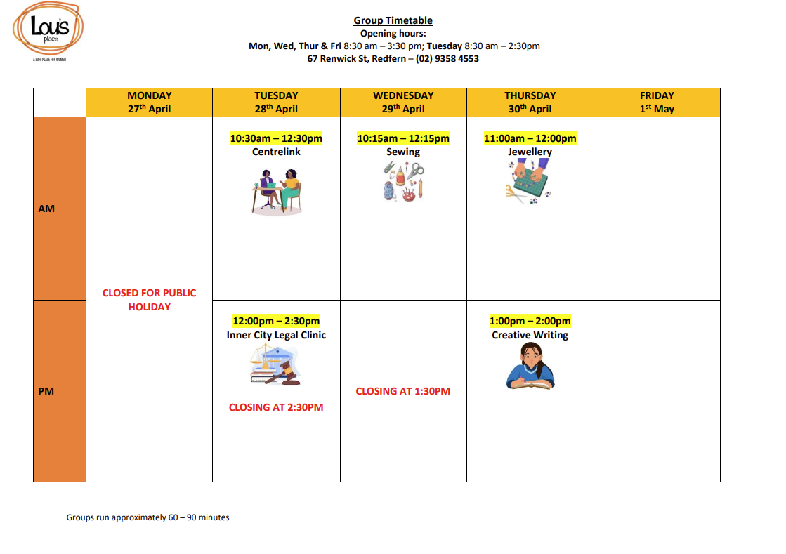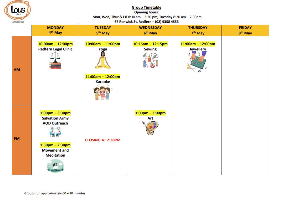Please be aware that all groups and appointment times are subject to change. Lou’s Place will advise of any changes where possible.